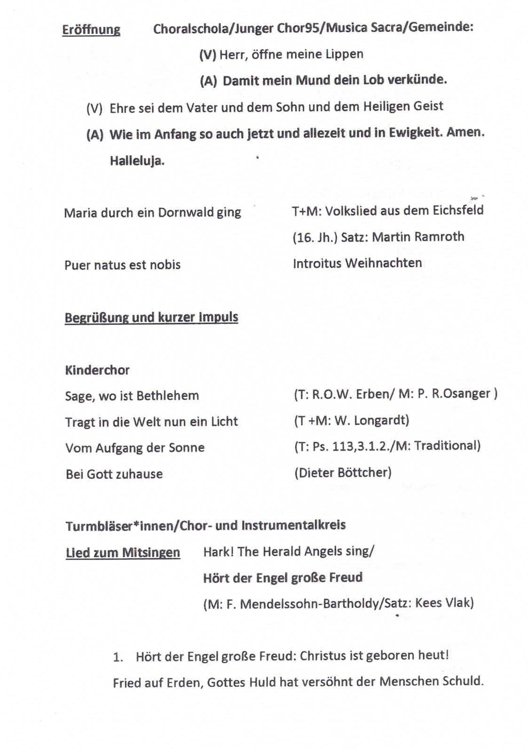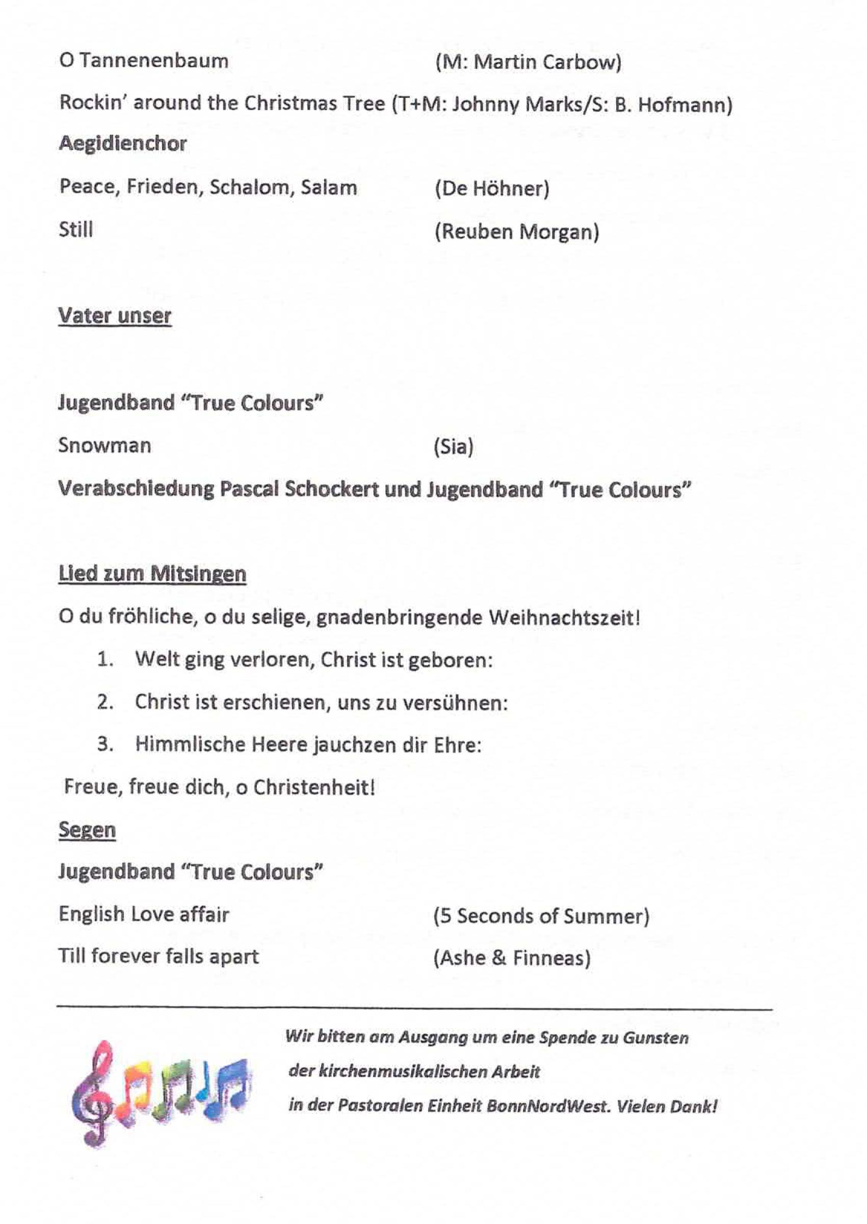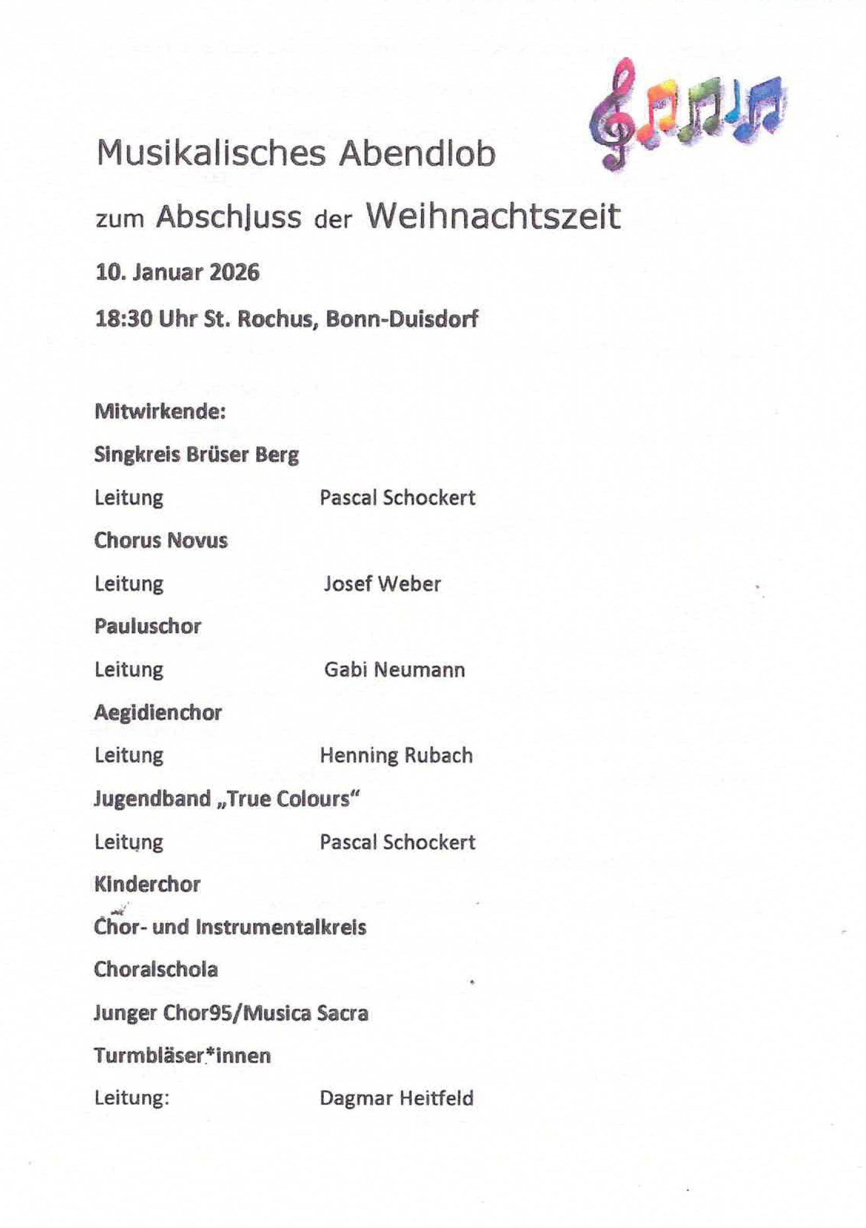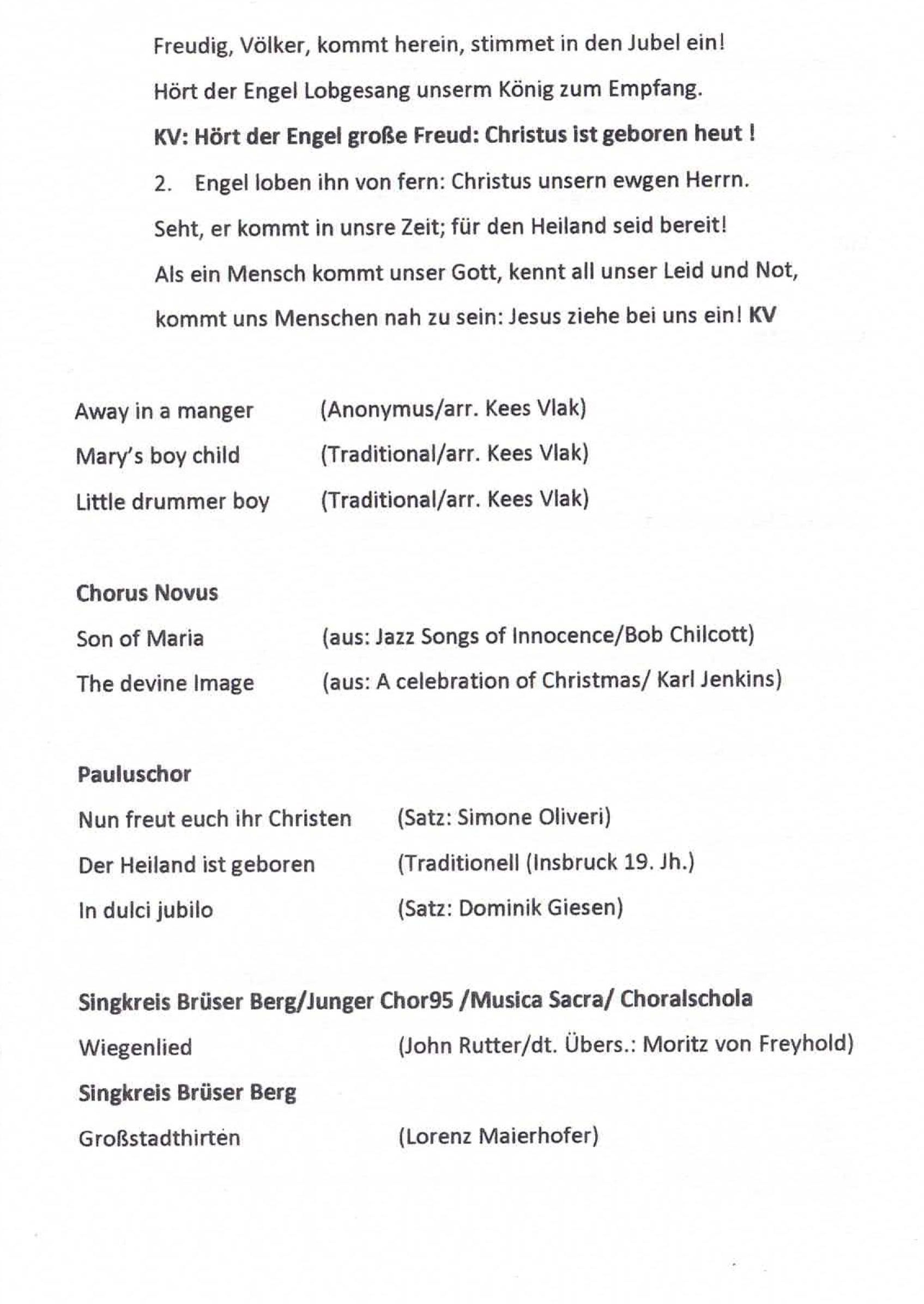 2026: Am Samstag, den 10.01.2026 waren wir beim musikalischen Abendlob zum Abschluß der Weihnachtszeit in St. Rochus, Bonn-Duisdorf mit dabei. Hier das Programm zum Abend 2025: Am Samstag, den 06.12.2025 traten wir beim Weihnachtsmarkt auf dem Brüser Berg auf. Am Samstag, den 06.09.2025 traten wir beim Familienfest auf dem Brüser Berg auf. Am Sonntag, den 15.06.2025 wirkten wir beim Abschlusskonzert der musikalischen Gruppen der Duisdorfer Kirchngemeinden in der Rochuskirche mit. 2024: Am Samstag, den 07.12.2024 traten wir beim Adventsfest auf dem Brüser Berg auf. Am Samstag, den 07.09.2024 traten wir beim Familienfest auf dem Brüser Berg auf. Am Sonntag, den 04.08.2024 machte der Singkreis einen Ausflug nach Köln-Höhenhaus, die neue Wirkungsstätte unseres früheren Leiters Henning Rubach. Hier eine kleine Bildauswahl. Am Sonntag, den 12.05.2024 begleiteten wir den Gottesdienst in der St. Edith-Stein-Kirche. Am Sonntag, den 17.03.2024 begleiteten wir den Gottesdienst in der Emmaus-Kirche. 2023: Am Samstag, den 09.12.2023 traten wir beim Adventsfest auf dem Brüser Berg auf. Am Samstag, den 02.12.2023 sangen wir beim Adventscafè auf dem Brüser Berg. Am Freitag, den 10.11.2023 sangen wir im Begleitprogramm zum Martinszug auf dem Brüser Berg. Am Samstag, den 26.08.2023 sangen wir beim Familienfest auf dem Brüser Berg. Am Sonntag, den 12.03.2023 sangen wir im Gottesdienst in der Emmaus-Kirche. 2022: Am Samstag, den 03.12.2022 sangen wir beim Adventsmarkt auf dem Brüser Berg. 2021: Nach der langen Corona-bedingten Pause hatten sich leider einige unserer Mitsänger und Mitsängerinnen dazu entschieden, nicht weiter im Singkreis mitzusingen. Und auch Andie Ruster konnte aus beruflichen Gründen nicht weiter dabei sein. Als sein Nachfolger hat Pascal Schockert die Leitung übernommen. Im November 2021 erfolgte der Neustart des Singkeises. 2020: Am Samstag, den 29.02.20 sangen wir beim Kunst- und Kreativmarkt auf dem Brüser Berg. Ein letzter Auftritt, bevor die Corona Pandemie das Leben und das gemeinschaftliche Singen veränderte. Am Sonntag, den 12.01.2020 waren wir ab 17:00 Uhr in St. Rochus, Bonn-Duisdorf bei der festlichen Abendmusik zum Abschluß der Weihnachtszeit zu hören. 2019: Am Sonntag, den 30.06.2019 sangen wir in St. Edith-Stein zum Jahresgedächtnis von Franz Dörrich und für alle anderen Verstorbenen aus dem Singkreis. Am Mittwoch, den 5.06.2019 verabschiedeten wir unseren langjährigen Chorleiter Henning Rubach. Nach 11 Jahren, in denen er den Singkreis prägte, nimmt er nun - nach seinem Bachelor in Kirchenmusik - eine Vollzeitstelle als Kirchenmusiker in Niederkassel an und kann den Singkreis daher nicht mehr weiter leiten. Als Nachfolger hat uns Henning Andie Ruster vorgeschlagen, der uns bereits bei einigen Auftritten begleitet hat und diese Herausforderung gerne annimmt. Wir wünschen Henning für seine berufliche und private Zukunft alles Gute und freuen uns, daß er im Herbst noch einmal für Andie einspringen wird, wenn dieser beruflich für ein 1/4 Jahr verhindert sein wird. Am Sonntag, den 17.03.2019 begleiteten wir den Gottesdienst in der Emmaus-Kirche. 2018: Am Sontag, den 07.10.2018 machten wir unseren Chorausflug und sangen zusammen mit dem Projektchor St. Margareta aus Graurheindorf in der Messe in Chorweiler. Danach ging es weiter nach Zons, wo wir nach dem Essen in der Torschenke noch die Gelegenheit zu einer Führung durch die Altstadt hatten. Am Abend fuhren wir dann wieder zurück nach Bonn. Hier eine kleine Bildauswahl. Am Samstag, den 22.09.2018 sangen wir im Wilhelmine-Lübke-Haus in Duisdorf. Am Samstag, den 07.01.2018 waren wir ab 17:00 Uhr in St. Rochus, Bonn-Duisdorf bei der Festlichen Abendmusik zum Abschluß der Weihnachtszeit zu hören. Am Freitag, den 13.10.2018 feiert wir unser 10-jähriges Bestehen mit einem Jubiläumskonzert in der vollen Emmaus-Kirche. Am Samstag, den 03.03.2018 sangen wir im Gemeindesaal der Emmaus-Kirche für die Behindertengemeinschaft Lieder aus unserem Repertoire. 2017: Am Sonntag, den 17.09.2017 begleiteten wir den Gottesdienst in der Emmaus-Kirche. Wir sangen aus Charles Gounod: Missa brevis Nr. 7 in C-Dur 2016: Am Samstag, den 26.11.2016 sangen wir im Wilhelmine-Lübke-Haus in Dusidorf und besuchten unseren ehemaligen Mitsänger Franz. Am Sonntag, den 09.10.2016 sangen wir die heilige Messe in St. Edith Stein: Charles Gounod: Missa Brevis Nr. 7 in C-Dur. Unterstützt wurden wir dabei von Musikern, sowie der Musica Sacra. Am Sontag, den 11.09.2016 machten wir unseren Chorausflug und sangen zusammen mit dem Projektchor St. Margareta aus Graurheindorf in der Messe im Kloster Steinfeld. Danach ging es nach Führung und Essen im Kloster noch zum Freilichtmuseum in Kommern. Am späten Nachmittag fuhren wir dann wieder zurück nach Bonn. Am Sonntag, den 10.01.2016 waren wir ab 17:00 Uhr in St. Rochus, Bonn-Duisdorf unter dem Motto "Gottes Stern leuchte weiter" - Programm für Sänger und Instrumentalisten - zu hören. 2015: Am Samstag, den 05.12.2015 haben wir auf dem Adventsmarkt des Brüser Berges gesungen. Am Mittwoch, den 08.11.2015 sangen wir beim Buss- und Bettagsgottesdienst in der Emmaus-Kirche. Am Sonntag, den 23.08.2015 sangen wir beim Gemeindefest auf dem Brüser Berg. Am 05.07.2015 trug der Singkreis zur musikalischen Gestaltung des letzten Gottesdienstes von Pfarrer Sareyko in der Emmaus-Kirche bei. Am 08.05.2015 sangen wir in der Namen-Jesu-Kirche für unser verstorbenen Mitsänger Jupp Ehrmann. Am Sonntag, den 08.02.2015 sangen wir beim Familienkonzert in der Emmaus Kirche. 2014: Am Samstag, den 06.12.2014 haben wir auf dem Adventsmarkt, Brüser Berg, gesungen. Am Sonntag, den 05.10.2014 haben wir beim Chorausflug zusammen mit dem Projektchor St. Margareta in Wuppertal gesungen. Am Sonntag, den 27.09.2014 haben wir beim Familienfest auf dem Brüser Berg gesungen. Am Sonntag, den 09.02.2014 traten wir bei den Brüser Berger Konzerten in E in der Emmaus-Kirche auf. 2013: Am Freitag, den 06.12.2013 h